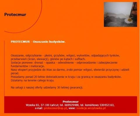 Osuszanie, odgrzybianie - pleśni, grzybów, wilgoci, wykwitów, odpadających tynków, przebarwień (ścian, elewacji), glonów po kątach i sufitach.