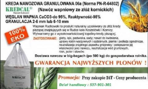 KREDCAL - Wapniak Rudkowski pochodzi ze złóż kredy piszącej znajdujących się w miejscowości Rudka koło KORNICY, niedaleko KOSZELÓWKI, dlatego odznacza się wyjątkową skutecznością odkwaszania. Można go stosować niemal przez cały rok, a w uprawach sadowniczych – nie ma potrzeby mieszania tego nawozu z glebą, (co jest konieczne w przypadku innych nawozów wapniowych)