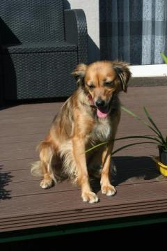 Z psami dogaduje się bez problemu, nie wykazuje źadnej agresji, jest bardzo przyjazna dla nich. Nie wiemy jak z kotami.
