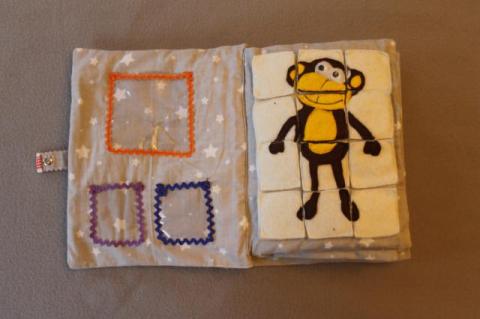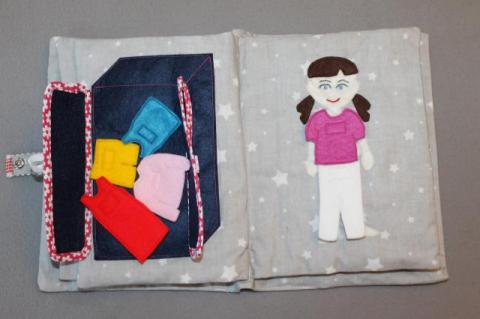 Książeczki sensoryczne wykonane ręcznie z miękkiego filcu i płótna. Zabawka ciekawa i pogodna. Zawiera różnorodne elementy takie jak: guziki, suwaki, rzepy, zatrzaski, elementy ruchome. Bawiąc się dziecko ćwiczy swoje umiejętności manualnie, dopasowuje kształty i kolory, uczy się liczyć ćwiczy, małą motorykę czy precyzyjne ruchy. Podana cena dotyczy jednej kartki. Koszt całej książeczki jest uzależniony od ilości kartek z których się składa.