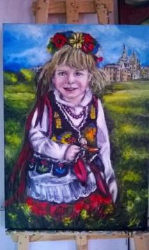 "Dziewczynka w stroju Krakowskim" - jest to obraz olejny na płótnie o wymiarach 70cm x 50cm. Obraz został namalowany prze zemnie we wrześniu 2017 roku. Sygnatura w prawym dolnym rogu obrazu. Obraz przedstawia dziewczynką w tradycyjnym stroju Krakowskim siedzącą na łące na tle zamku. Cena obrazu 550 zł. Obraz dostępny na mojej stronie internetowej na podstronie Na Sprzedaż