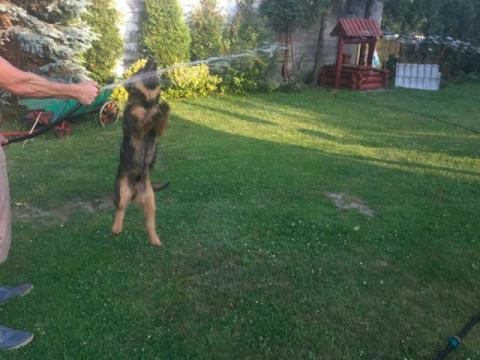 Szczeniak jest rozkoszny, uwielbia się bawić, skakać a jago ulubionym zajęciem jest kąpanie się w basenie lub jeziorze. J
