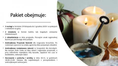 W Ośrodku Rekreacyjnym Ryterski przygotowaliśmy właśnie dla Ciebie atrakcyjny Pakiet Andrzejkowy „Dobra wróżba wypoczynku”.