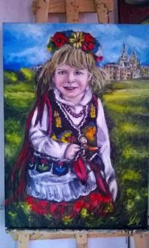 "Dziewczynka w stroju Krakowskim" - obraz olejny na płótnie o wymiarach 70cm x 50cm. Obraz został namalowany prze zemnie we wrześniu 2017 roku. Sygnatura w prawym dolnym rogu obrazu. Obraz przedstawia dziewczynką w tradycyjnym stroju Krakowskim siedzącą na łące na tle zamku. Cena obrazu 550 zł. Obraz dostępny na mojej stronie internetowej na podstronie Na Sprzedaż