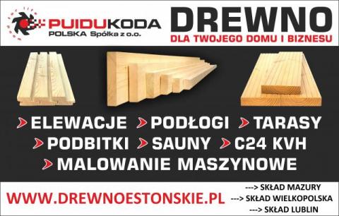 Zapraszamy do naszego składu drewna - posiadamy szeroki asortyment materiałów do wykonania elewacji, tarasów, podłóg jak również drewno konstrukcyjne i C24, termodrewno, sauny zewnętrzne oraz wewnętrzne, produkty do samodzielnego wykonania saun i akcesoria saunowe. Malujemy maszynowo na indywidualne zamówienie klienta. Po szczegóły zapraszamy do naszego składu od poniedziałku do piątku od godz.8 do godz.16 - Skład LUBLIN - Dominów 163, 20-388 Lublin, tel. (+48) 723 850 333, e-mail: lublin-biuro@puidukoda.eu