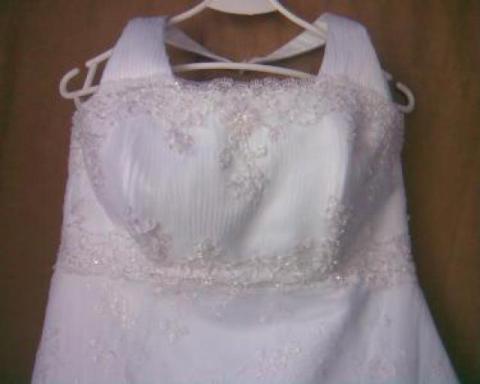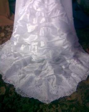 Sprzedam suknię ślubną jednoczęściowa,w kształcie klasycznej litery A, na kole, w kolorze białym. Rozmiar 38. Kupiona 07.05.2010, założona tylko na czas ceremonii. Stan idealny. Suknia posiada atłasowy tren podwiązywany na troczki, wykończony szeroką koronką, jest odcinana pod biustem, gorset usztywniony fiszbinami, szelka na szyję, pokrycie z koronki wyszywane w drobny, lekko błyszczący, kwiatowy wzór.