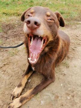 Czoko to około roczny chłopak, waga 18kg, wielkości średniej błąkający się po lesie. Czoko na początku ogromnie przestraszony, udało się go złapać na klatkę łapkę, teraz lgnący do człowieka. Psina jest przyjacielska, przytulaśna, czuje ogromną podporę w człowieku. W sytuacjach dla niego nowych siada na stopach człowieka i wciska się w niego, lecz wystarczy odrobina zachęty i zaczyna być ciekawy świata.