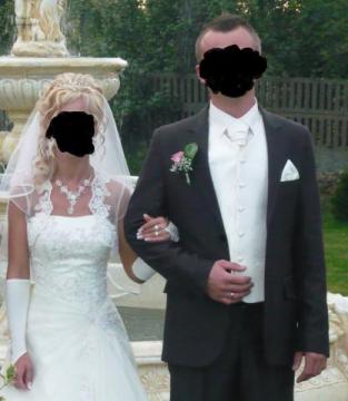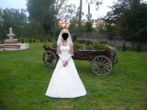 Sprzedam suknię ślubną, jednoczęściową, pięknie zdobioną, z długim podpinanym trenem, kolor sukni ecri, rozmiar 36, wzrost 160,zakupiona w salonie. Gratis welon dwuczęściowy, buty roz. 37, rękawiczki.Cena do uzgodnienia. Zdjęcia wyśle e-mailem. Zapraszam