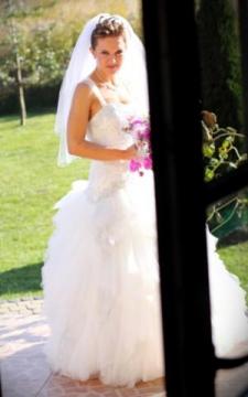 Zjawiskowa suknia ślubna z kolekcji Herms 2010/2011, raz założona, ma piękny tren z możliwością podpinania go na guziczek, wspaniale wychodzi na zdjeciach. Góra cała w kryształkach. Rozmiar 36/38 z możliwością dopasowania i przerobienia. Do sukni długie rękawiczki gratis. Zachęcam do oglądania - jest w komisie w centrum Lublina.