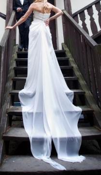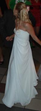 Mam do sprzedania śliczną suknię ślubną od brytyjskiego projektanta Agusta Jones – Carli z kolekcji 2010. Kupiłam ją w Londynie na wyprzedaży za £800 ( rzeczywista cena £1500) Sukienka jest w bardzo dobrym stanie. Wykonana jest z jedwabiu, chodząc w niej mamy wrażenie, że płyniemy. Błyszczący jedwab tworzy podszewkę, natomiast zewnętrzne warstwy z jedwabnego szyfonu są fałdowane tak że tworzą delikatny drapowany styl sukienki. Do sukienki jest wszyty gorset który zawiązuje się z tyłu. Sukienka jest wyprana i wyprasowana. Ma delikatny tren który można puścić luźno lub podpiąć z tyłu. W obu wersjach bardzo ładnie to wygląda. Bardzo wygodna i świetnie układa się w tańcu. Jest możliwość przymierzenia sukni w dniach 2-7 kwietnia 2012. Szczegółowe pytania proszę kierować na maila: monika.szolle@yahoo.pl