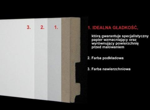 Listwy przed malowaniem oklejane są przelotowo specjalnym papierem wzmacniającym i wygładzającym powierzchnię listwy. Dzięki temu listwa jest IDEALNIE GŁADKA, pozbawiona wszelkich nierówności.