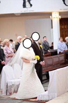 1-częściowa, lekka i elegancka. Uszyta z najwyższej jakości organtyny w modne zakładki, podpinany tren, kształt w literę A wyszczupla sylwetkę. Z tyłu gorset regulowany. Rozmiar 36/38. Wzrost ok.165 cm plus obcas . Gratis: halka, welon długi (2 m) i krótki, rękawiczki, bolerko.