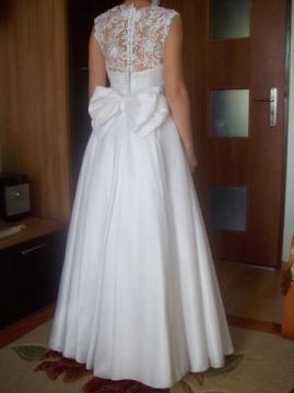 Sprzedam piękną białą suknię ślubną, szytą w salonie sukien ślubnych w Lublinie na rozmiar 34/36 oraz wzrost 156 cm + 9 cm na obcas. Góra z gipiury obszytej delikatnymi perełkami, dekolt w łódkę, wszyty biustonosz. Tył zapinany na guziczki, efektowna kokarda dodaje uroku całej sukni. Dół uszyty z dobrej jakości włoskiego materiału w kontrafałdy, które nadają idealny kształt. Do sukni dołączam halkę (halka nie posiada koła) oraz szal. Suknia jest bardzo wygodna, niezniszczona. Chętnie odpowiem na wszelkie pytania, zapraszam również do przymiarki. adres e-mail: mkopron@gmail.com