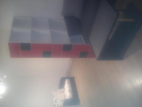 Mieszkanie wyposażone w telewizor, 2 duże szafy z drzwiami suwanymi, regał na książki, fotel rozkładany, kanapę rozkładaną oraz stolik.