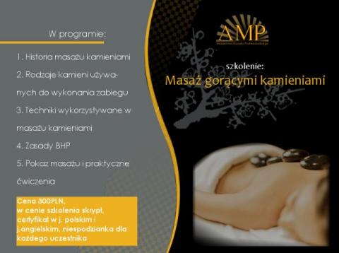 30 maja w sobotę o 10.30 w Wyższej Szkole Społeczno-Przyrodniczej im. Wincentego Pola, odbędzie się szkolenie z masażu gorącymi kamieniami.Wszystkich chętnych zapraszamy serdecznie do udziału. Akademia Masażu Profesjonalnego www.ampszkolenia.pl, info@ampszkolenia.pl