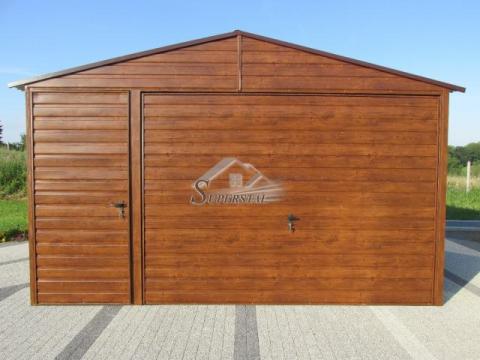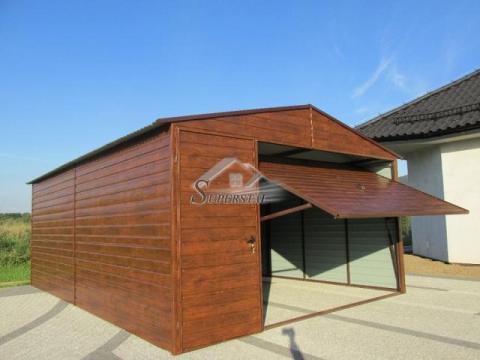 uchylną podnoszoną do góry oraz dodatkowymi drzwiczkami. W kolorze orzech wygląda bardzo estetycznie. Wzmocniona konstrukcja i blacha hutniczo pokryta kolorem pozwalają cieszyć się wyglądem i funkcjonalnością garażu przez długie lata. Jest to bardzo funkcjonalna konstrukcja, ze względu na zastosowanie bramy uchylnej w garażu blaszanym.