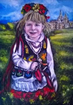 "Dziewczynka w stroju Krakowskim" - jest to obraz olejny na płótnie o wymiarach 70cm x 50cm. Obraz został namalowany prze zemnie we wrześniu 2017 roku. Sygnatura w prawym dolnym rogu obrazu. Obraz przedstawia dziewczynką w tradycyjnym stroju Krakowskim siedzącą na łące na tle zamku. Cena obrazu 550 zł. Obraz dostępny na mojej stronie internetowej na podstronie Na Sprzedaż