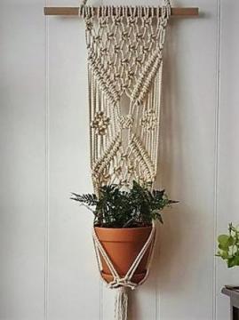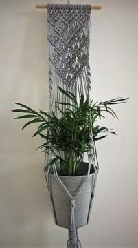 Kwietnik makrama pleciony z bawełnianego grubego 5mm sznurka osadzony na naturalnym drewnie.