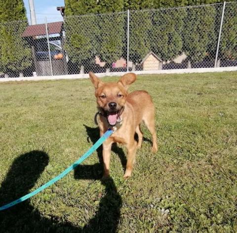 Całusek ma ok. 3 lat, toleruje psy i koty, chodzenie na smyczy nie stanowi problemu, zachowuje też czystość w domu.