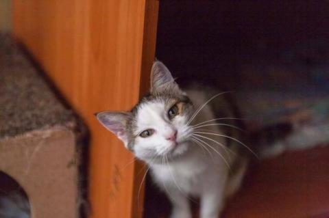 Gabi - ma obecnie ok 4 lata. U nas jest już ponad 2,5 roku. To zbyt długo dla psychiki zwierzęcia. Nie lubi blisko siebie obecności innych kotów. Jest wtedy rozdrażniona, szuka spokojnego miejsca. Przy opiekunie jest tzw. kotką gadająca, która robi różne figury, aby zwrócić na siebie uwagę. Gabi jest uroczą, ok 4 - letnią koteczką (ur.2015).