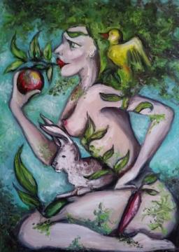 Sprzedam obraz olejny na płótnie o wymiarach 100cm x 70cm. Weganin jest surrealistyczną metaforą idei ekologicznego,nie inwazyjnego współistnienia ze środowiskiem. Obraz namalowałam w 2018. Sygnatura na dole obrazu. Boki zamalowane w kolorach obrazu – nie wymaga ram. Cena : 1400 PLN
