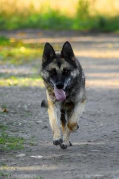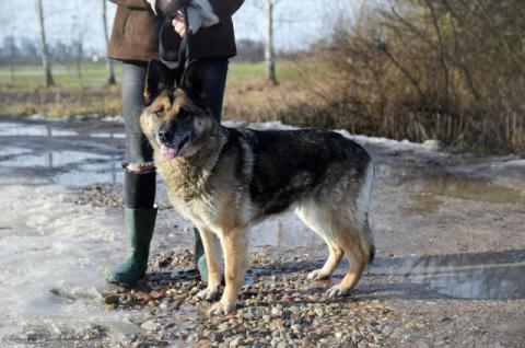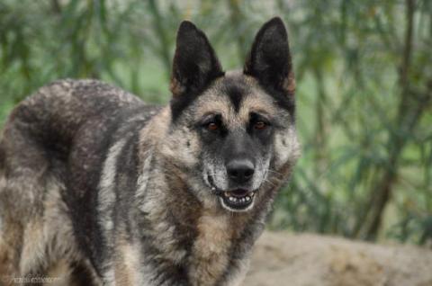 Mucha to około 8 letnia suczka w typie owczarka niemieckiego. Trafiła do nas, odebrana interwencyjnie. Wegetowała na 2 metrowym łańcuchu, śpiąc w lichej budzie. Jej życie było proporcjonalne do długości łańcucha. Na dodatek, Mucha zamknięta była w szczelnie zabudowanym kojcu. Właściciel uniemożliwił jej każdy kontakt ze światem. Nie wiemy jak długo tak żyła... Mimo to Mucha jest bardzo przyjacielska.