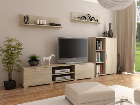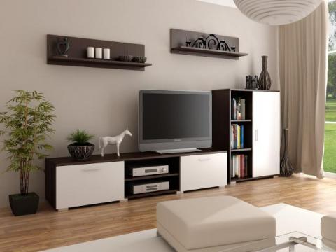 W skład meblościanki wchodzi: szafka rtv, szafka stojąca oraz 2 półki wiszące.