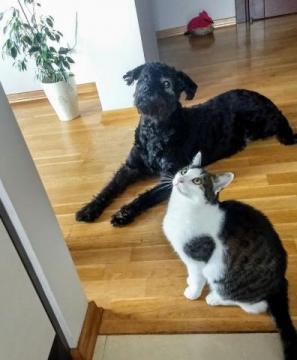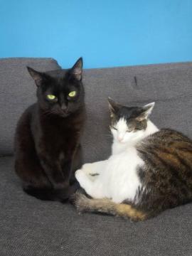 Dwie przyrodnie, trzyletnie siostry, biała-Rysia czarna-Nela. Obie grzeczne i ułożone, korzystają z kuwety i drapaka, nie niszczą mebli. Wychowywały się razem ale różnią się nie tylko kolorem futerka, mają również przeciwstawne charaktery. Młodsza z rodzeństwa, Nela posiada prawdziwie królewski rodowód – jej matka, rosyjska niebieska była wielokrotnie nagradzaną czempionką. Znajduje to odbicie w jej charakterze. Jest spokojna, porusza się z lekkością i gracją, bez niepotrzebnej gonitwy. Podczas jedzenia nie śpieszy się i nie je „na zapas”. Lubi bawić się piórkami i pluszowymi myszkami. Jest uległa, ale sama decyduje o porze na czułości. Druga z nich, Rysia, to prawdziwy pieszczoch, który uwielbia, gdy poświęca jej się dużo uwagi. Darzona uczuciem, odwzajemnia je. Z lubością śpi w nogach i przychodzi się przywitać niezależnie od pory powrotu do domu. Lubi bawić się małymi dzwoneczkami, nie lubi metalicznego dźwięku składanych sztućców i dźwięku odkurzacza. Jest niewybredna przy jedzeniu , jest łakomczuchem. Szybko zjada swoją porcję i podkrada Neli.