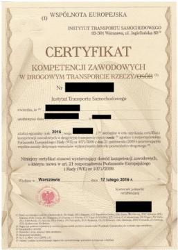 Użyczę Certyfikatu Kompetencji Zawodowych w Drogowym Transporcie Rzeczy niezbędnego do uzyskania: „Zezwolenia Na Wykonywanie Zawodu Przewoźnika Drogowego” (Licencji na Kraj) oraz „Licencji Transportowej Międzynarodowej”.