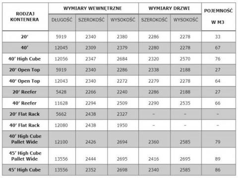Poniżej w tabeli przedstawiamy wymiary kontenerów morskich. Najważniejszym z nich jest z całą pewnością wymiar wewnętrzny, ponieważ to od niego zależy, jak dużo towarów można załadować do kontenera.