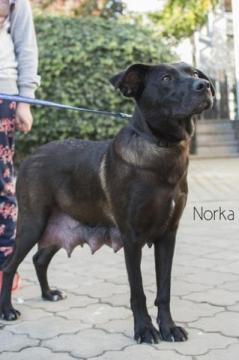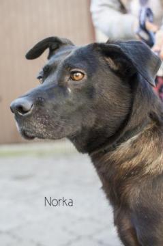 Norka to młoda 1-2 -letnia suczka, która urodzila w polu swoje szczeniaki.