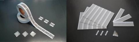- Etykieta samoprzylepna o wymiarze 4x4 cm lub 5x5 cm w technologii radiowej o częstotliwości 8,2 MHz z kodem kreskowym lub biała.