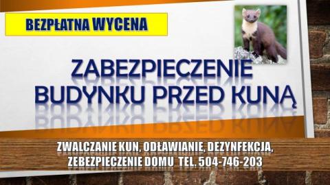 Zabezpieczenie domu przed kuną, płoszenie, zwalczanie. Oferujemy zabezpieczenie domu przed zwierzętami. Cennik usługi tel. 504-746-203. Jeśli w Twoim domu słychać odgłosy drapania, piski, najprawdopodobniej zamieszkała w nim kuna. Zwierzęta wykorzystują poddasza, wolne przestrzeni zakładając legowisko, zostawiają ślady i odchody, przegryzają izolację oraz niszczą ocieplenie budynku. Zabezpieczenie domu, budynku, otworów wejść, odstraszanie zwierząt. Skuteczny sposób na kuny. To nie tylko klatki, tzw. żywołapki.