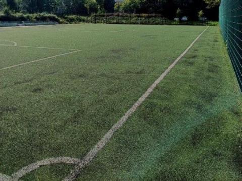 Używane boisko piłkarskie ze sztucznej trawy z zasypką.