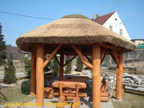 Altany produkujemy z grubych bali z pokryciem dachu strzechą (32cm).