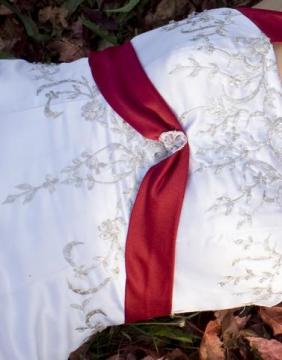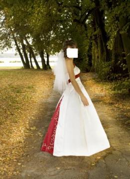 sprzedam oryginalna sliczna suknie slubna w stanie bardzo dobrym. suknia jest na halce w ksztalcie kola przez co pieknie sie układa. Tyl sukienki ma piekny klin z czerwonego materialu z ozdobnymi srebrymi haftami. Przod sukienki zdobiony jest czerwona szarfa wokół której również sa piekne zdobienia srebrnymi haftami z ozdobnymi koralikami. Na dole sukienki jest delikatny srebrny haft z koralikami przez co ladnie całość się komponuje z gora sukienki.