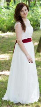 Ramiona i gorset są pokryte koronką, cały dół jest pokryty bardzo delikatnym, matowym jedwabiem. Pas z bordowego, matowego materiału można zawiązać na krawatkę tak jak u mnie, można zawiązać z tyłu na kokardę lub całkowicie go odczepić. Gorset jest mocny, ładnie modeluje sylwetkę, lecz jednocześnie suknia jest lekka.