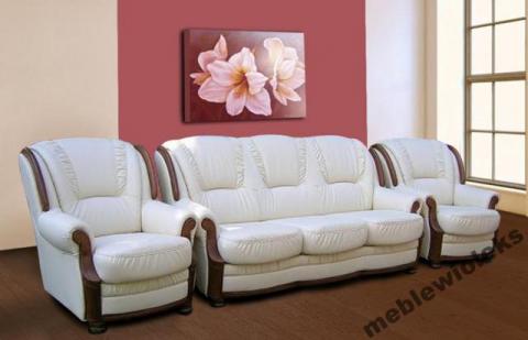 Komplet wykonany jest w systemie sprężyn bonelowych, co zapewnia naprawdę wysoki komfort użytkowania. Meble są bardzo reprezentacyjne, a elegancji dodają im listwy wykończeniowe, które wykonane są z drewna bukowego. Elementy ozdobne mogą wystąpić w różnej kolorystyce, w zależności od upodobań klienta.