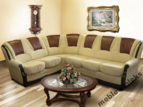 Niepowtarzalny fason narożnika sprawdza się zarówno w nowoczesnych jak i klasycznych wnętrzach !!! Siedziska posiadają wypełnienie w systemie sprężyn bonelowych (przez co bardzo dobrze sprawdzają się przy częstym użytkowaniu), natomiast oparcia wykonane są na bazie sprężyn spiralnych. Elementy ozdobne są wykonane z drewna bukowego o różnej kolorystyce, w zależności od upodobań klienta. Narożnik może być lewo lub prawostronny. Meble są fabrycznie nowe i prosto z mojej pracowni. Polecam !