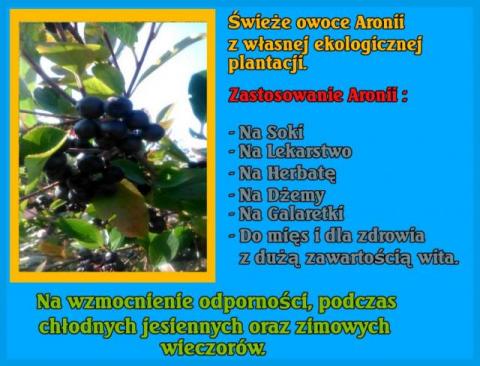 Sprzedam świeże owoce aronii z własnej plantacji. Cena: 3,50 zł/kg + koszt wysyłki. Owoce aronii posiadają właściwości lecznicze. Są stosowane do produkcji soków, herbaty, lekarstw. Pomagają w przypadku nadciśnienia, opóźniają postępowanie chorób oczu, łagodzą skutki chemioterapii oraz radioterapii oraz wyrównują poziom cukru w organizmie. Owoce aronii wysyłam w solidnie zapakowanych paczkach, od poniedziałku do czwartku, za pośrednictwem firmy kurierskiej DPD. Koszt wysyłki owoców do 30 kg wynosi 17 zł. UWAGA. Minimalna ilość zamówienia to 10 kg aronii. Oprócz aronii mogę zaoferować także owoce żurawiny bagiennej (leśnej) w cenie 20 zł/kg oraz pigwowca japońskiego - 10 zł/kg. Więcej informacji udzielę tel: 721916493 (po godz. 20.00) bądź drogą mailową: lesnaskarbnica@gmail.com.