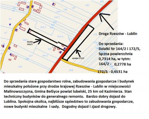 Do sprzedania stare gospodarstwo rolne składające się z dwóch działek o łącznej powierzchni 73 ar, zabudowane budynkami gospodarczym i mieszkalnym w stanie technicznym do generalnego remontu. Położenie to miejscowość Malinowszczyzna, Gmina Bełżyce powiat lubelski. Dogodny dojazd do Lublina jak i do Kazimierza. Jedno z ostatnich starych gospodarstw rolnych w tej okolicy dostępne do zakupu. Doskonałe zarówno do celów rolniczych jak i rekreacyjnych. Polecam.