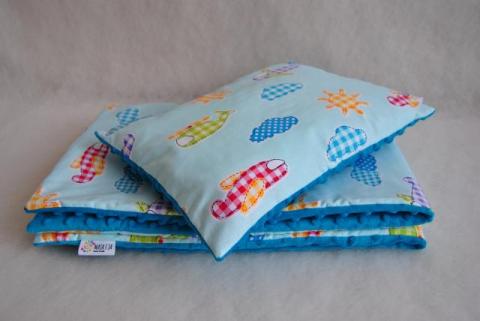 Kołderka o wymiarach 75x100 (+/-2 cm) oraz poduszka 30x40(+/-2 cm). Dla dzieci i niemowląt, kocyk idealny do wózka, łóżeczka czy kołyski. Sprawdza się jako mata. Lekki i bardzo miły w dotyku.